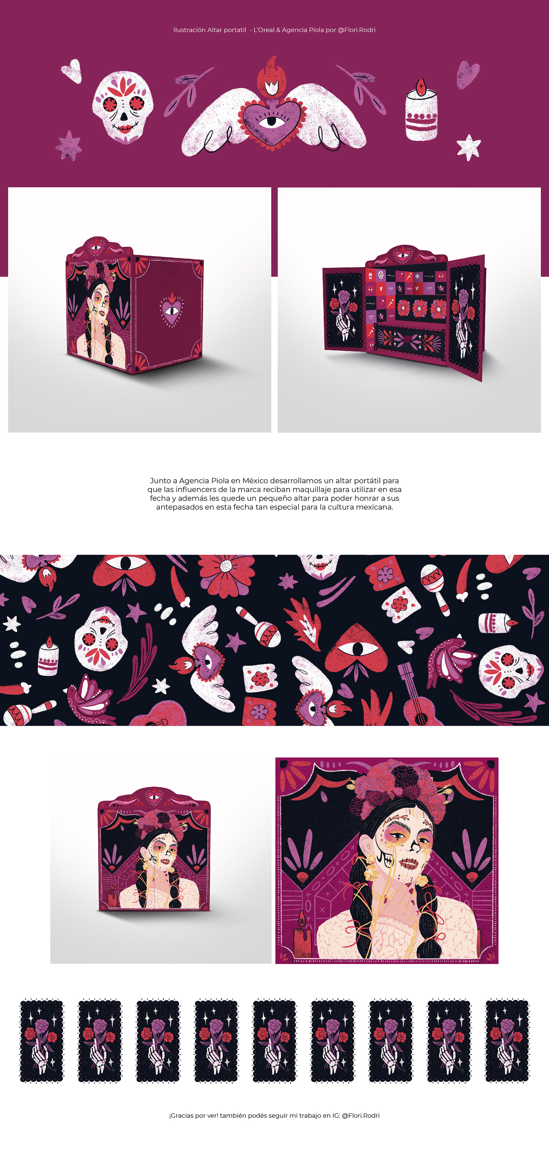 Junto a Agencia Piola en México desarrollamos un altar portátil para que las influencers de la marca reciban maquillaje para utilizar en esa fecha y además les quede un pequeño altar para poder honrar a sus antepasados en esta fecha tan especial para la cultura mexicana.